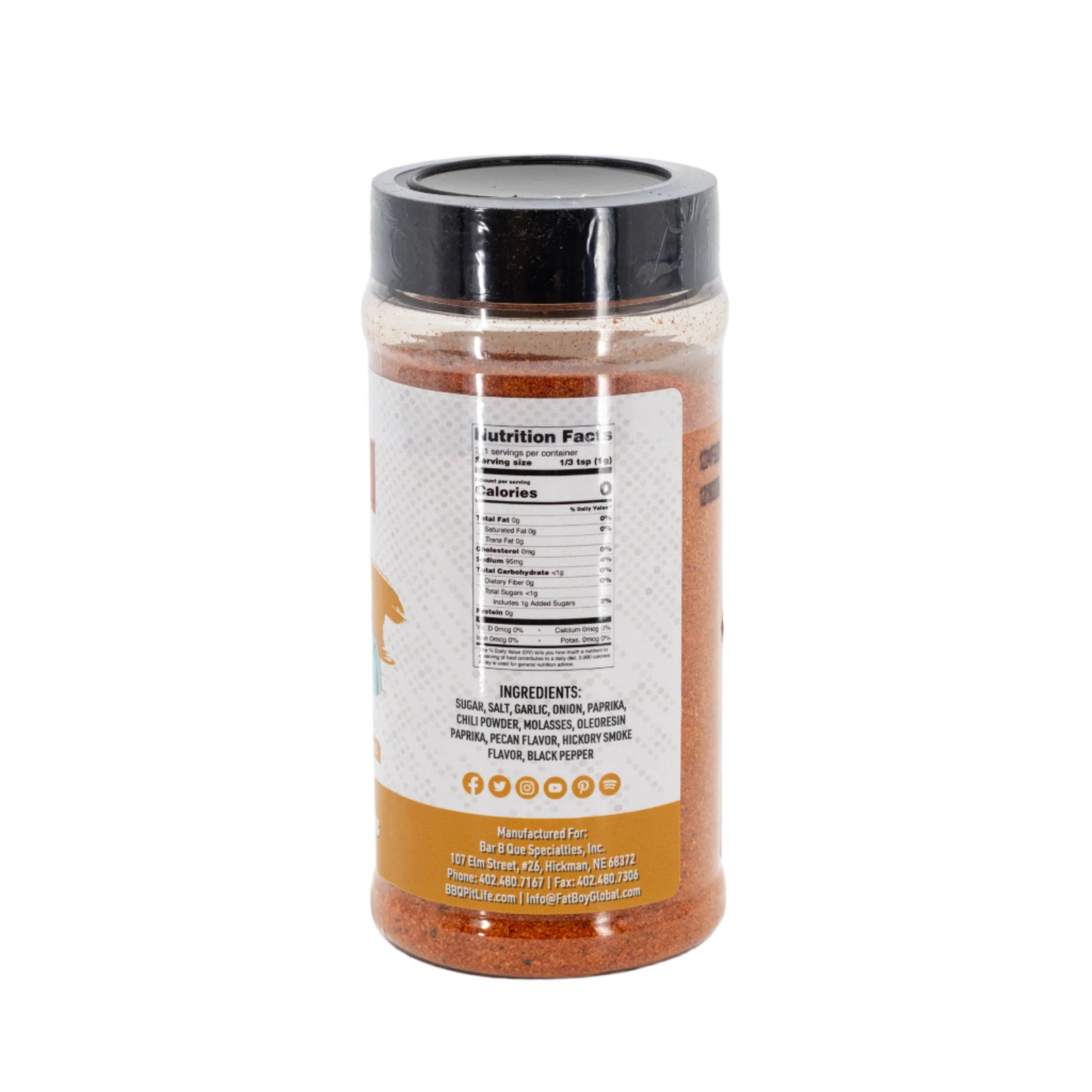 Ingredients: Sugar, Salt, Spices Including Chili Pepper, Molasses Powder (Molasses And IP Maltodextrin), Dietary Fiber, Onion, Garlic, Paprika, Jalapeno, Extractives of Paprika (Color) and Natural Hickory Smoke Flavor.